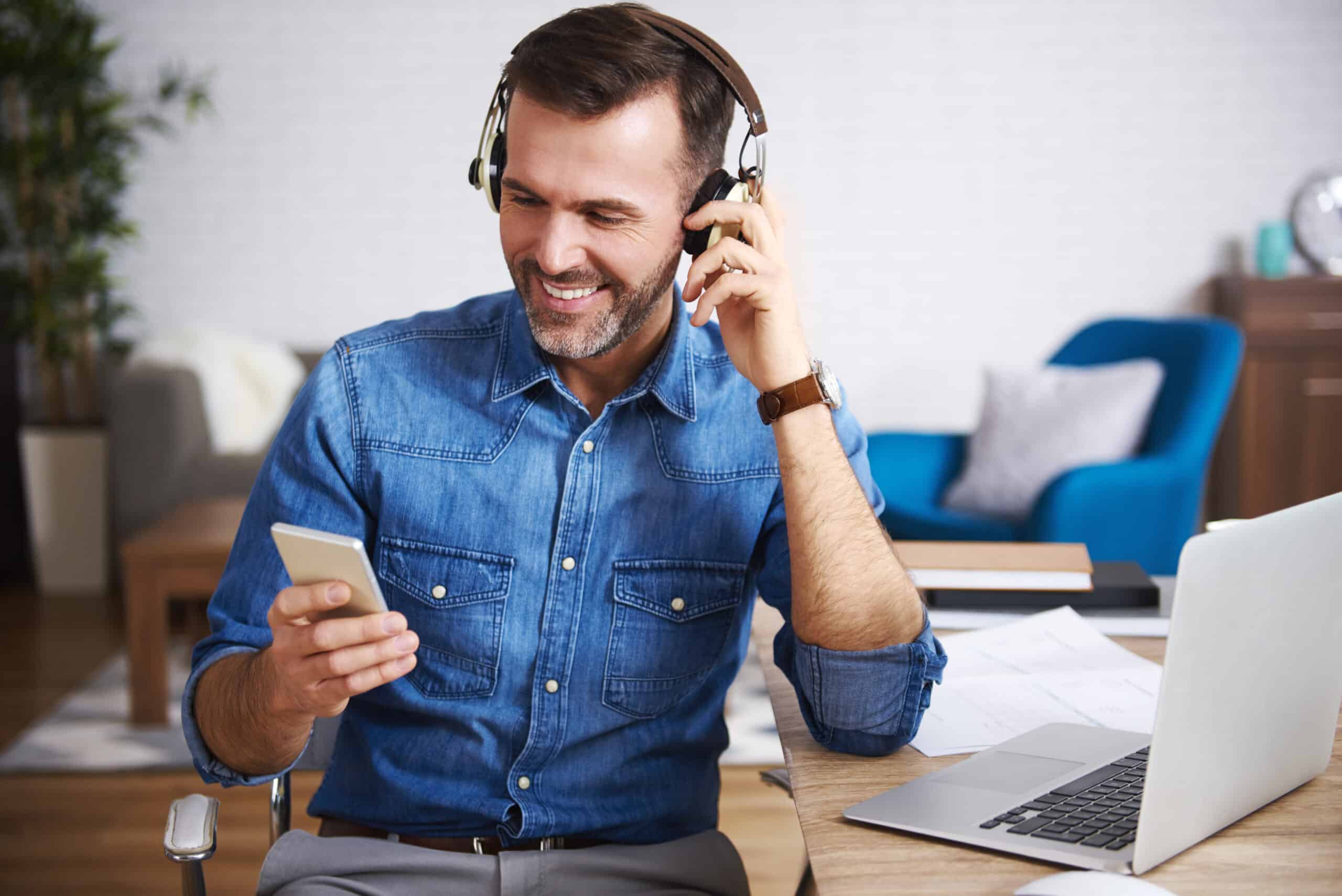 Happy man listening to music and using mobile phone ← Précédent Suivant → Happy man listening to music and using mobile phone