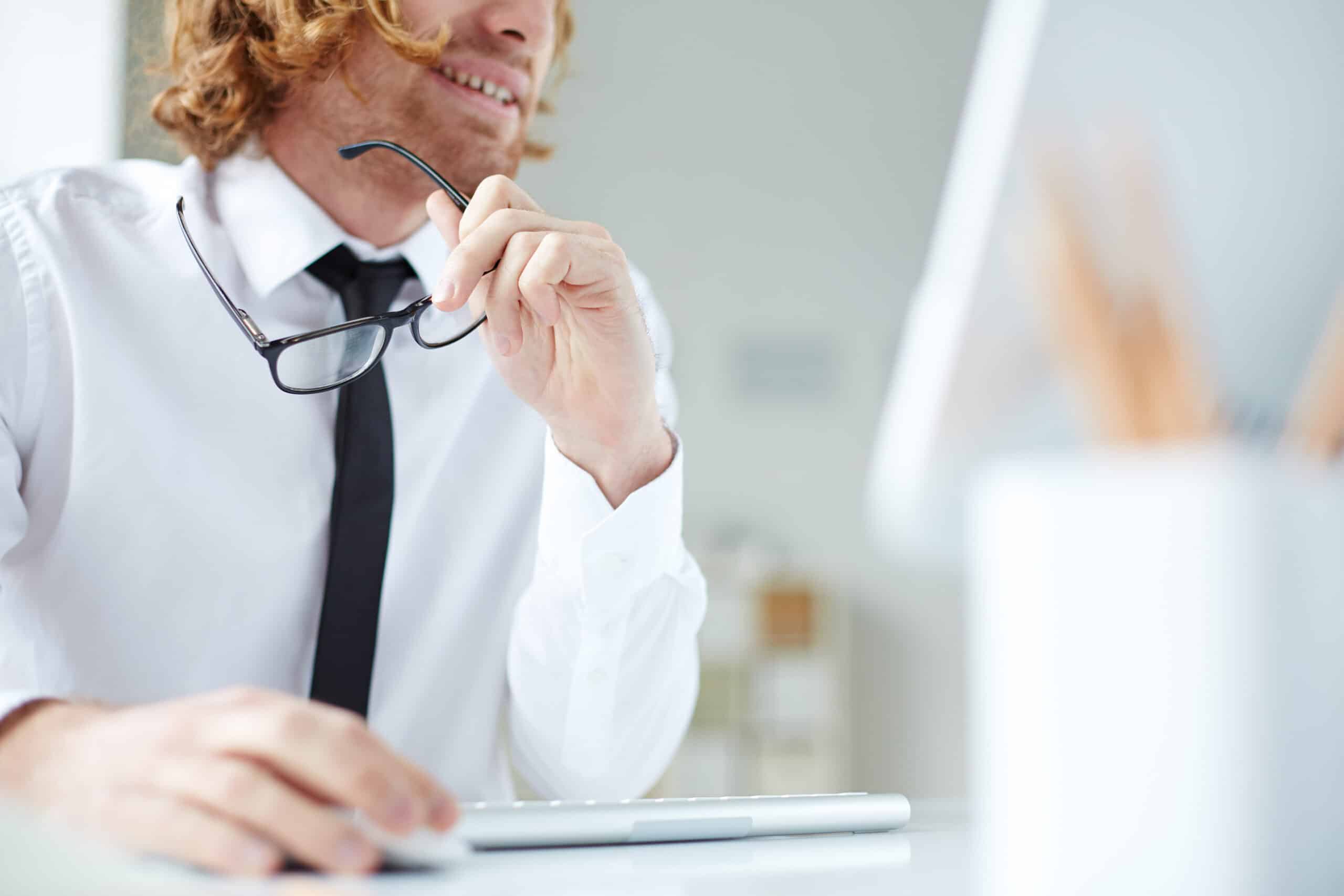 Office enthusiasm ← Précédent Suivant → Office worker sitting at computer and looking at the screen with interest