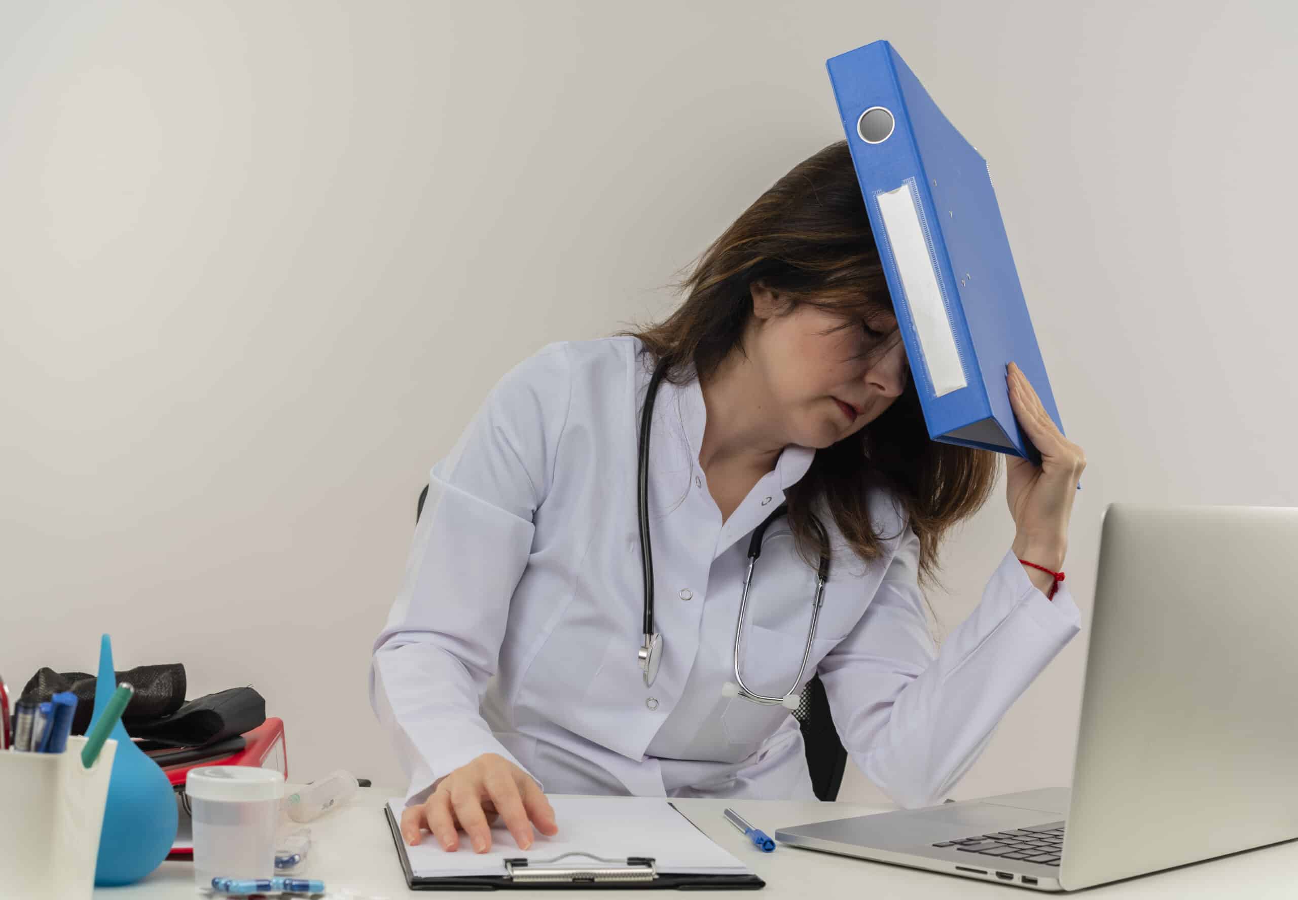 tired middle aged female doctor wearing wearing medical robe with stethoscope sitting at desk work on laptop with medical tools putting folder on head on isolated white backgroung with copy space